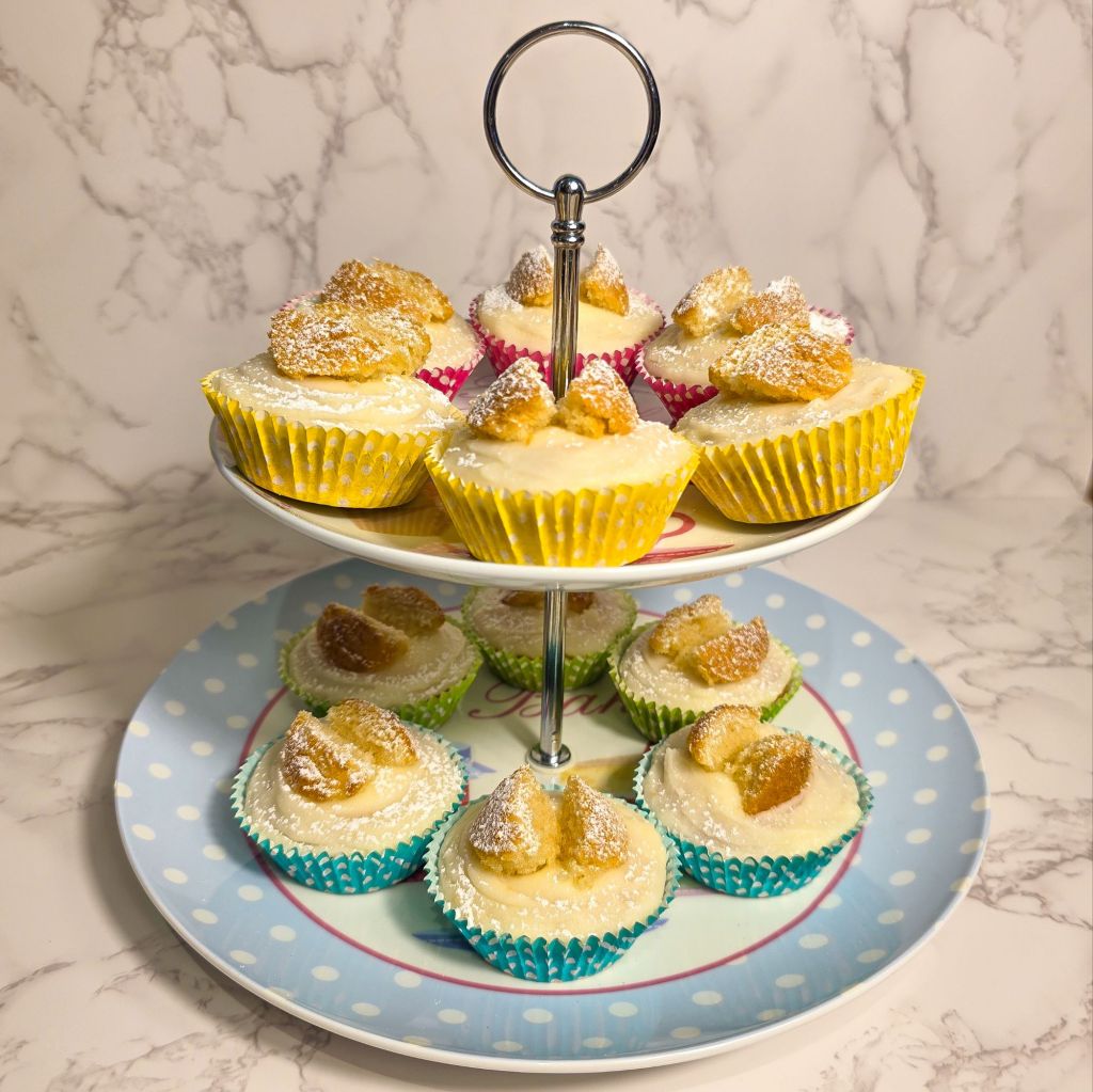 - Add the icing to the top of each cupcake using a pallet knife or a piping bag then arrange the pieces of sponge on top to resemble butterfly wings