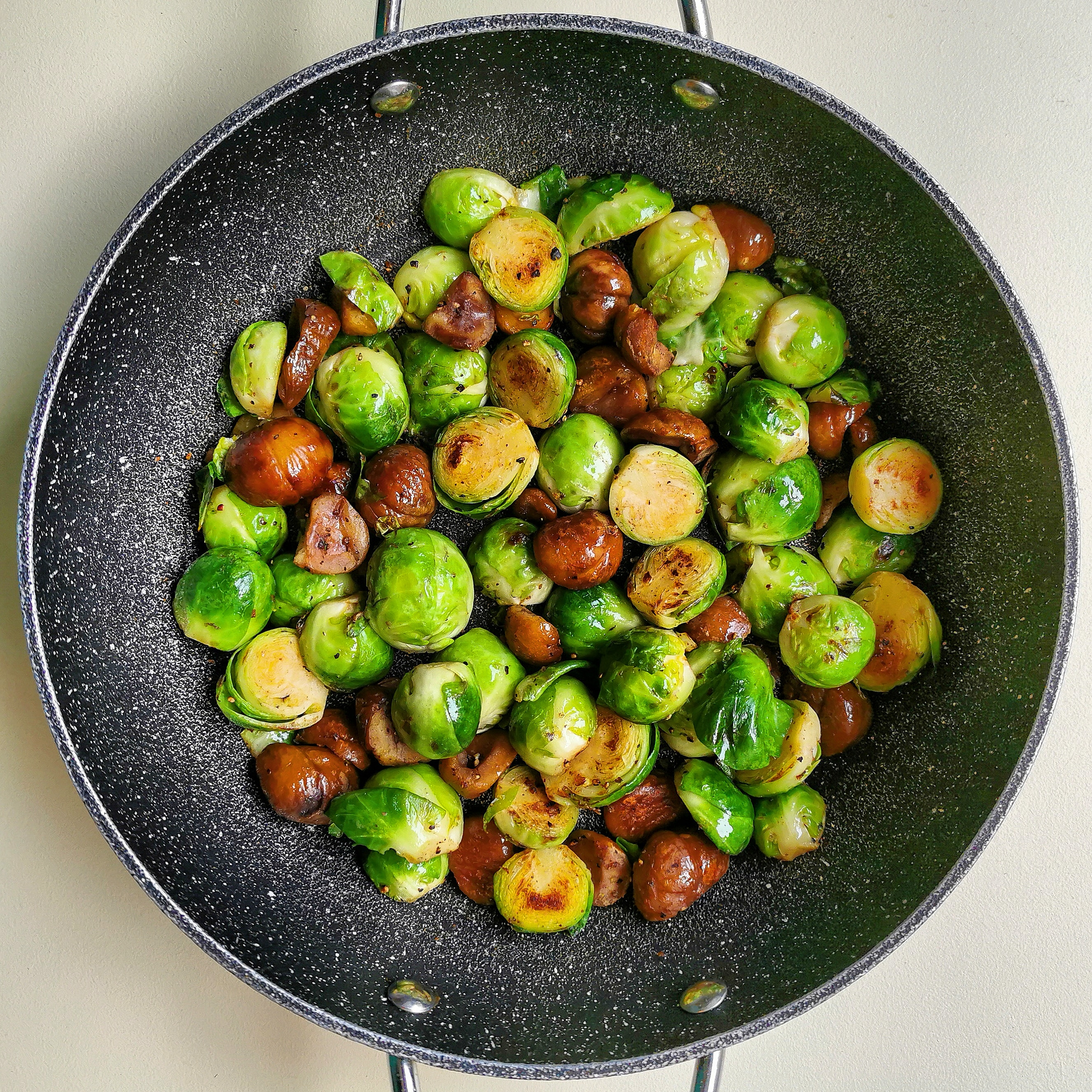 - Place the brussel sprouts and chestnuts on the lined baking tray. Put the tray in the pre-heated oven and bake for 20-25 minutes, or until golden brown