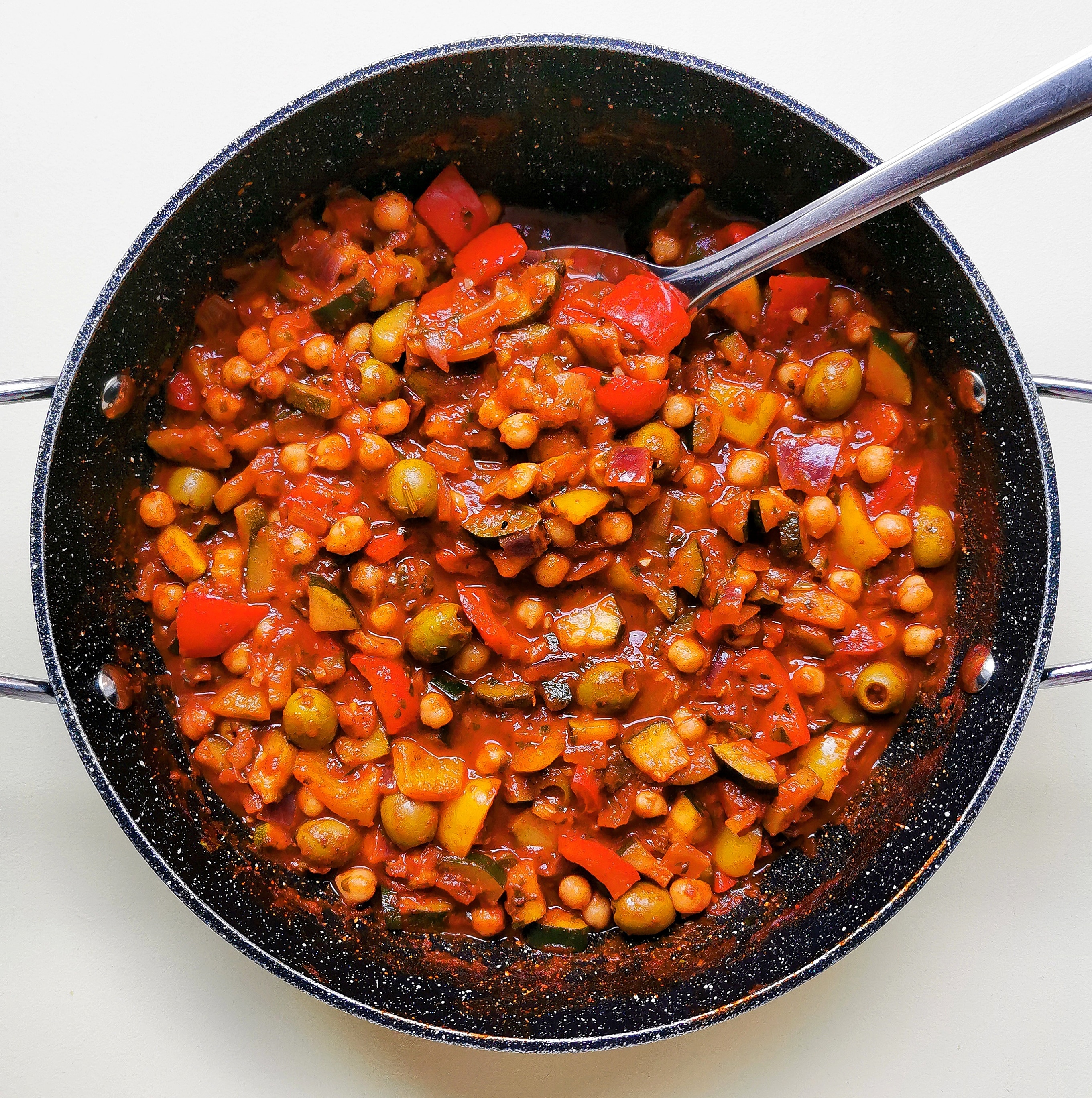 - Chop the courgette and bell peppers in to bite size pieces. Add the courgette and bell peppers to the pan along with the chickpeas and olives