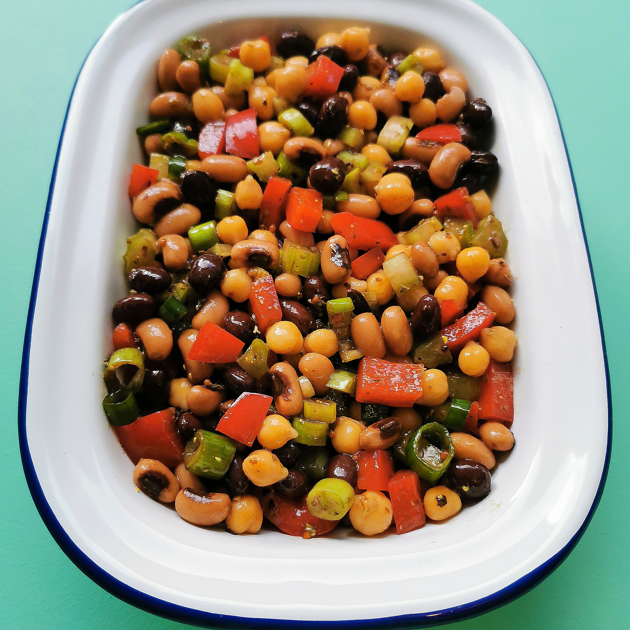- Add the bell peppers, celery and spring onions to a large bowl along with the black beans, black eyed beans, chickpeas and haricot beans